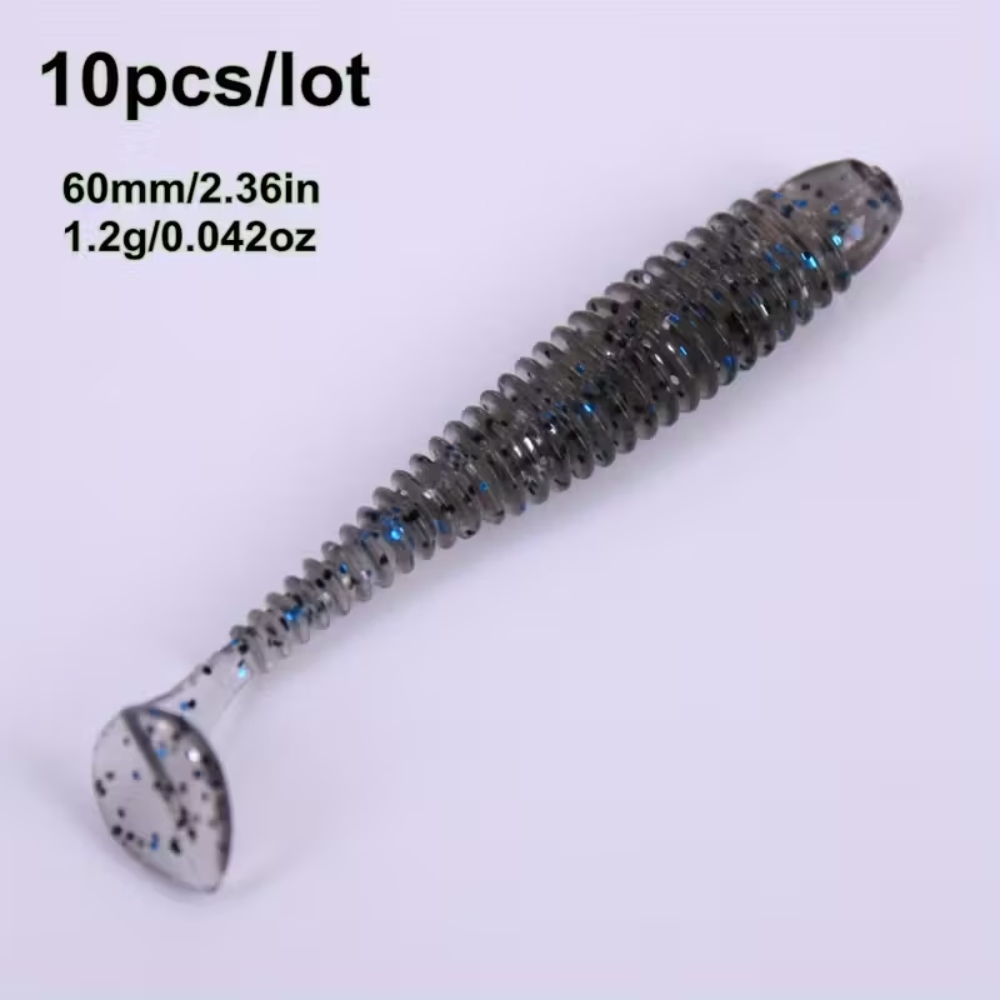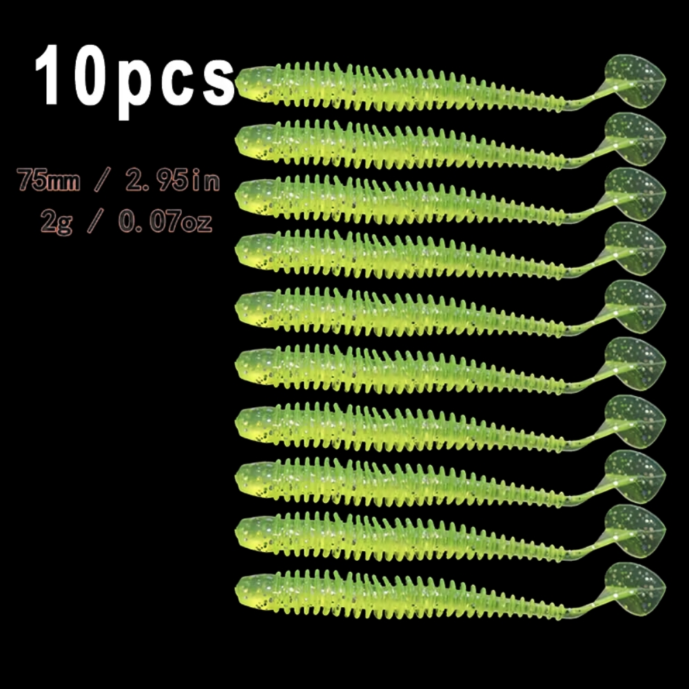 Suitable for both saltwater and freshwater environments, these swimbaits are widely used for targeting species such as bass, carp, and other predator fish. Their ribbed worm-style structure helps create subtle water movement, making them useful for multiple fishing styles including jigging, casting, and slow retrieval.